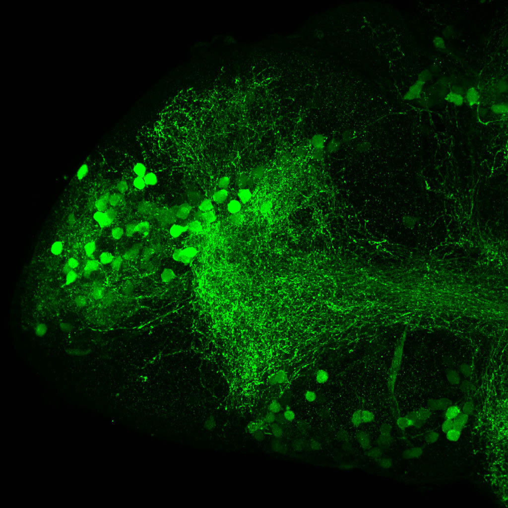 Tg(Pet1:KalTA4) drives expression in serotinergic raphe neurons. In the images below, this driver line was crossed to Tg(14XUAS:mRFP,Xla.Cryg:GFP)tpl2(Auer et al., 2014) and larvae were labelled with anti-RFP and anti-SV2 antibodies to visualise serotinergic raphe neurons and their projections. For a detailed description of the serotinergic system in zebrafish read the excellent Lillesaar et al., 2009 paper. For an overview of the serotinergic system look at our neurotransmitters section.